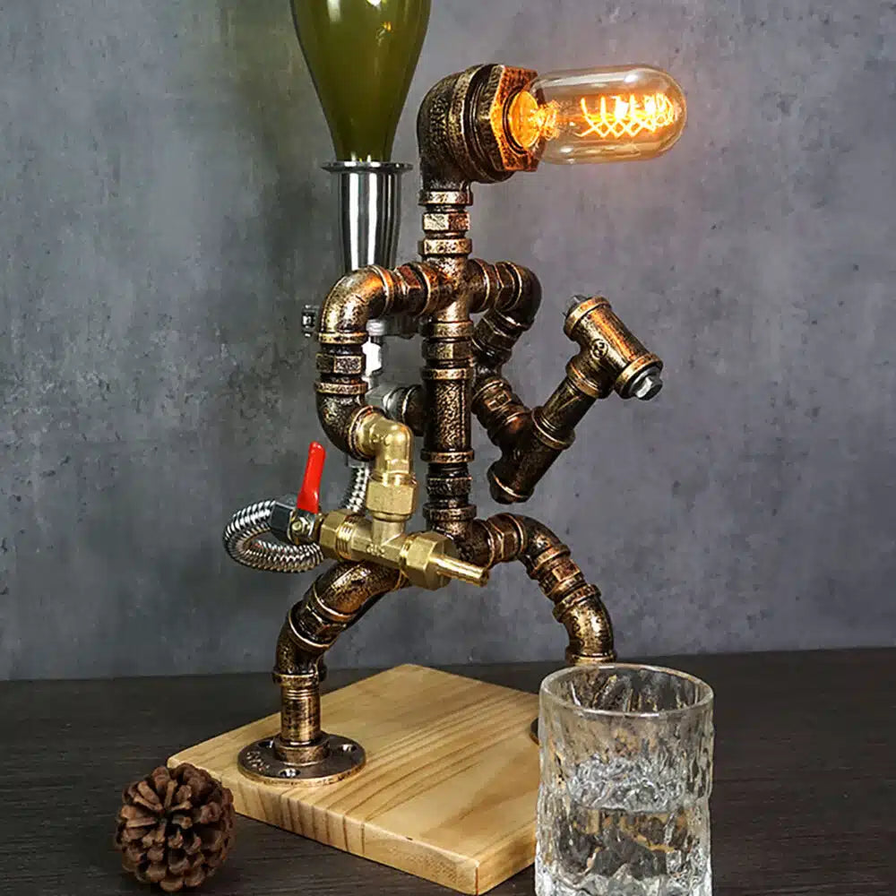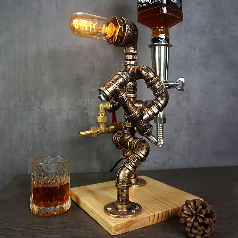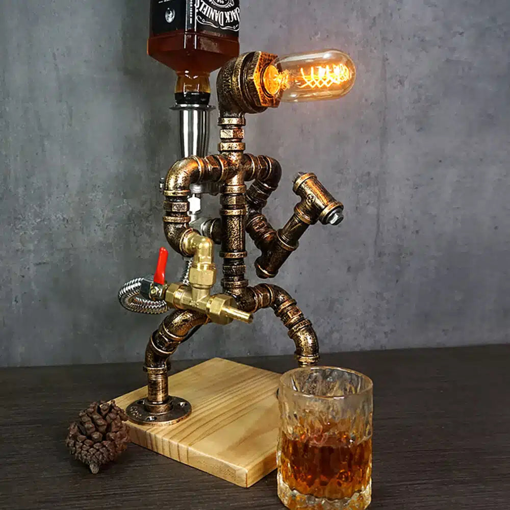 Transforme seu bar ou ambiente de convivência com o Dispenser de Whisky com Luminária Industrial – Modelo Bombeiro, uma peça que une funcionalidade, iluminação decorativa e arte steampunk. Com design inspirado em um bombeiro empunhando um martelo, este decanter-luminária é produzido com canos metálicos em acabamento cobre envelhecido, conexões em aço inox e latão, criando um visual marcante e cheio de personalidade.